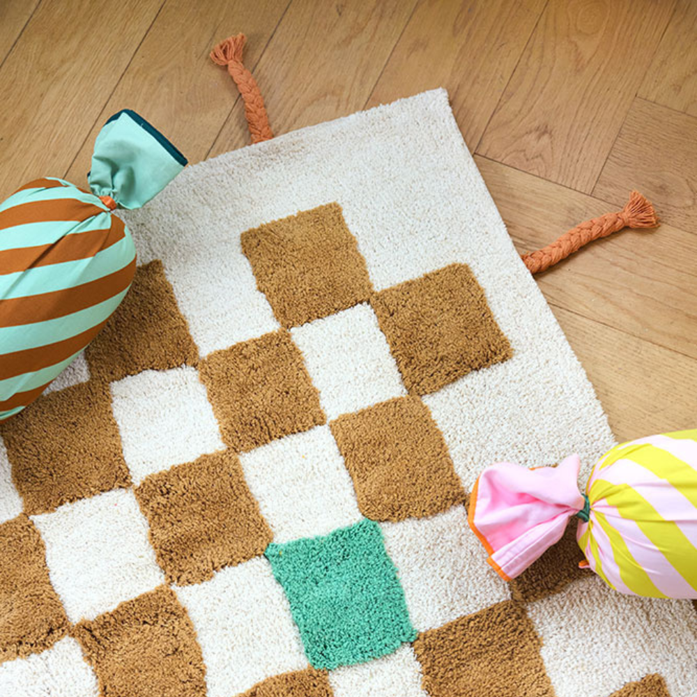 Inspirowany niepokornym stylem Pippi, ma wzór w kwadraty wykonany techniką tuftowania, co daje delikatny efekt 3D i wyjątkowo miłą w dotyku fakturę dla bosych stóp.