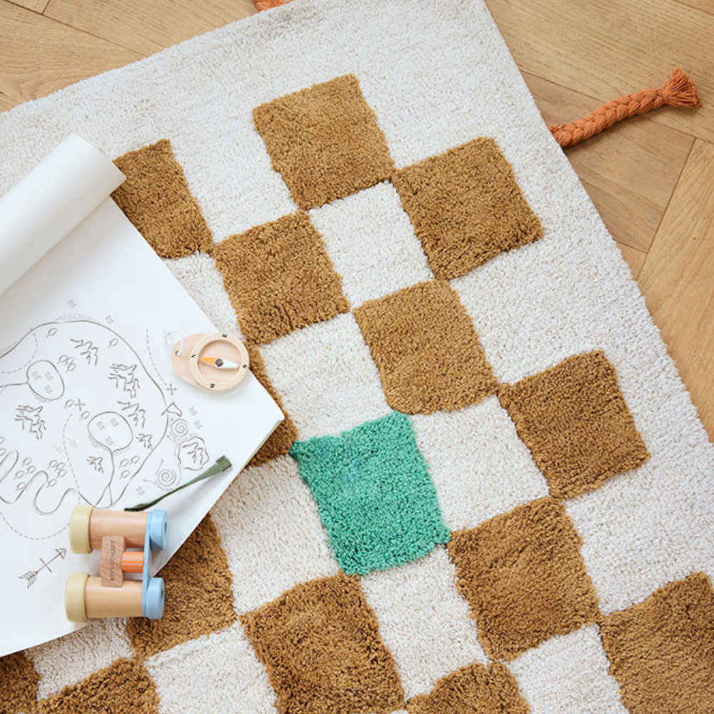 Dywan tuftowany w szachownicę pomaga wyznaczyć strefę zabawy, zachęca do kreatywnych gier i wspiera rozwój zmysłów poprzez kontrastowe pola oraz wyczuwalną strukturę.