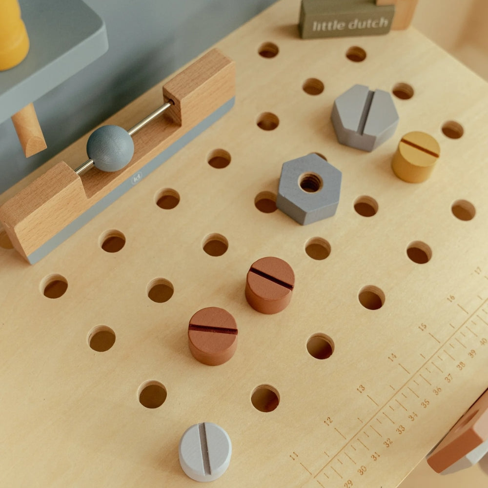 Warsztat z narzędziami Little Dutch to solidna, drewniana zabawka stworzona z myślą o małych majsterkowiczach, którzy uwielbiają naśladować dorosłych i tworzyć własne konstrukcje.