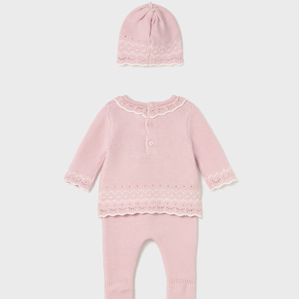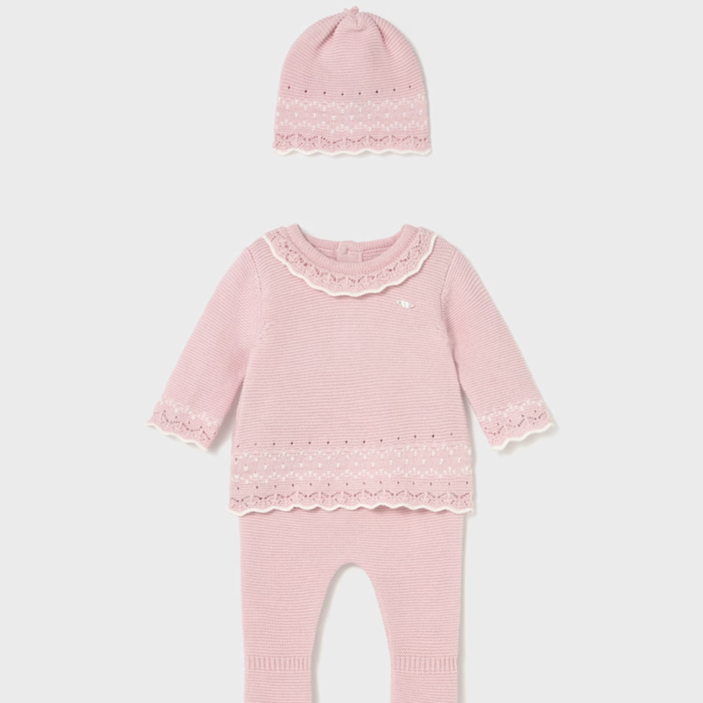 Komplet trykotowy dla noworodka Mayoral to miękki, trzyczęściowy zestaw stworzony z myślą o pierwszych miesiącach życia maluszka.