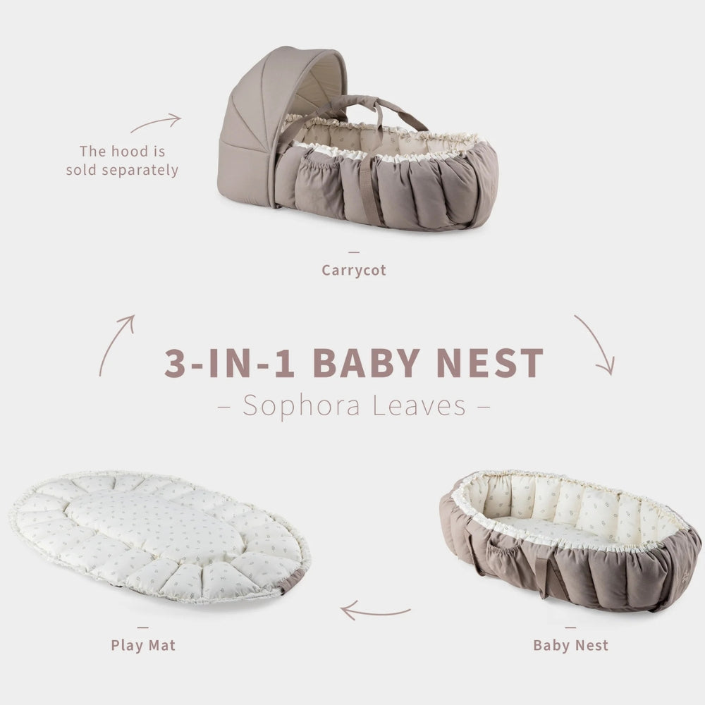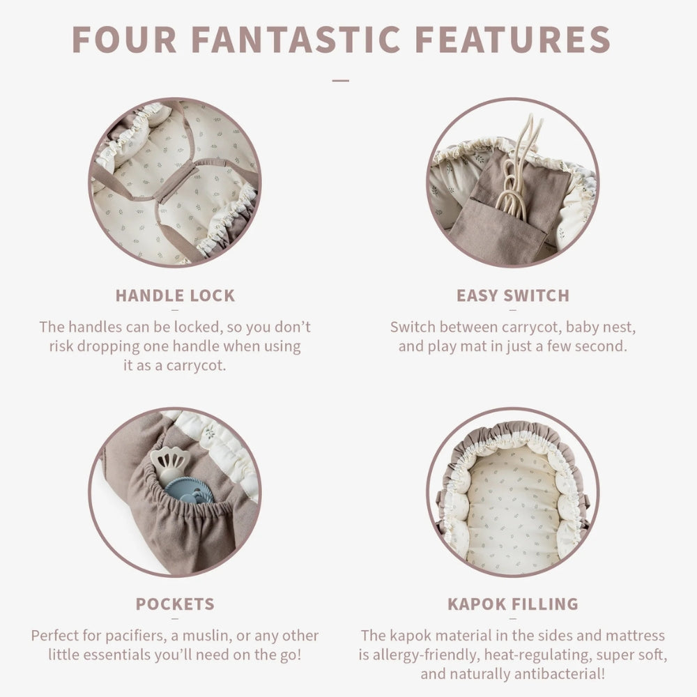 Ten innowacyjny produkt 3 w 1 pełni funkcję wygodnego kokonu niemowlęcego, przenośnego nosidełka oraz dużej maty do zabawy po odpięciu boków.