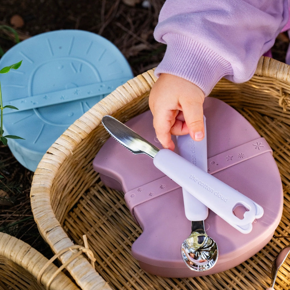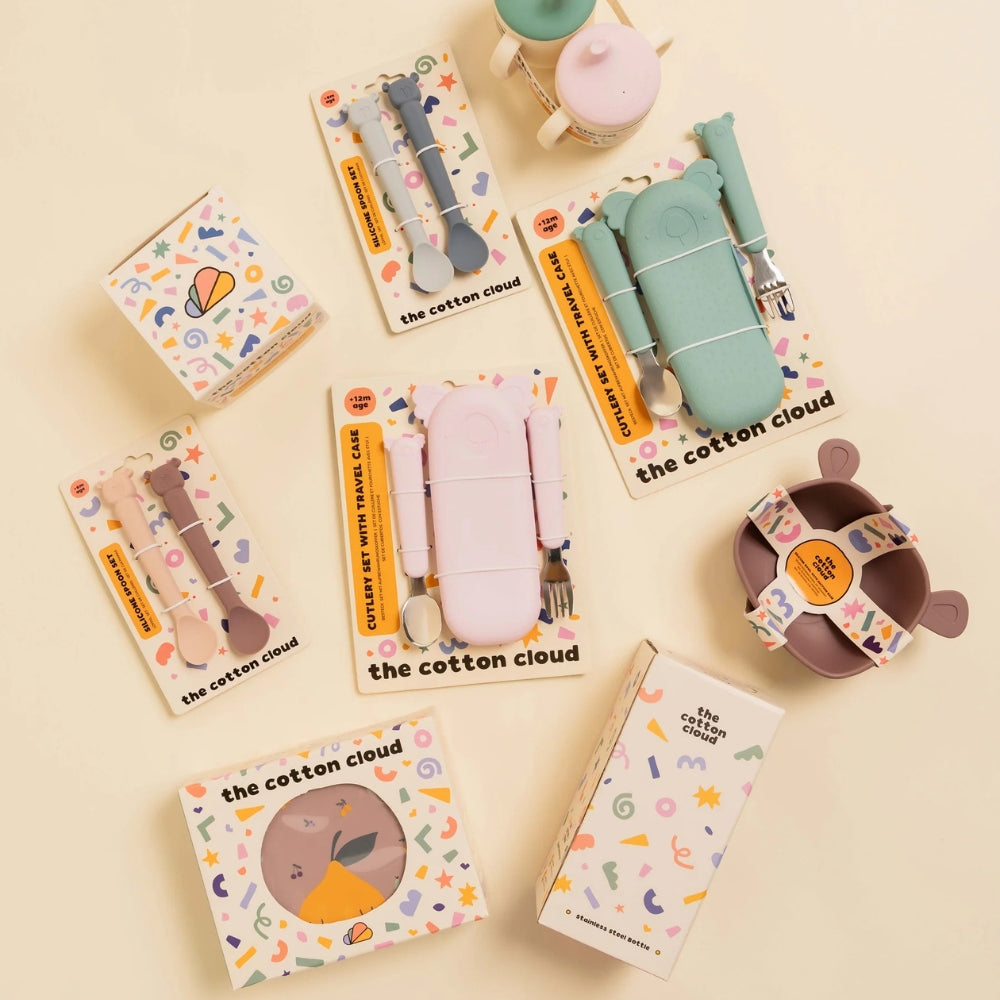The Cotton Cloud zadbało również o aspekt praktyczny – do zestawu dołączona jest silikonowa osłonka, która pozwala higienicznie przechowywać sztućce dziecięce w domu i w podróży.