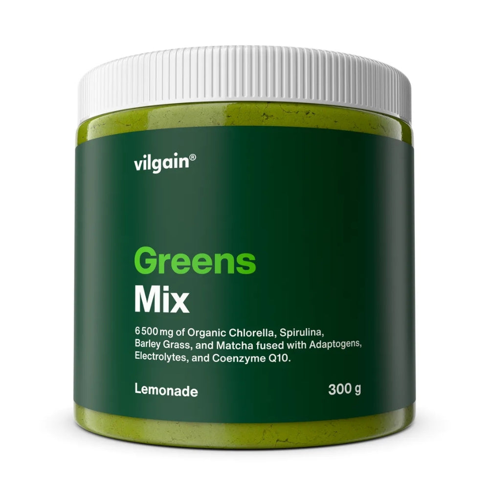 Greens Mix marki Vilgain to mieszanka 13 aktywnych składników, w tym spiruliny, chlorelli i jęczmienia, które wspierają codzienną witalność oraz naturalną odporność.