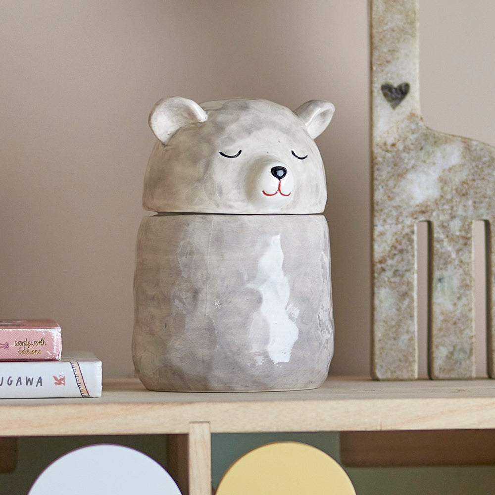 Słoik Bloomingville MINI Puk z pokrywką w szarym kolorze to piękny dodatek, który ociepli dziecięcy pokój i pomoże uporządkować drobiazgi.