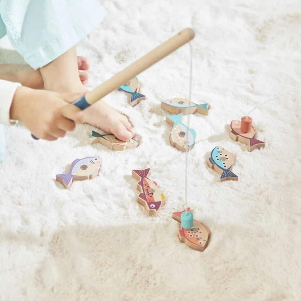 Dzięki dwóm drewnianym wędkom z magnesem dziecko może łowić kolorowe rybki i ćwiczyć pewny chwyt oraz precyzyjne ruchy.