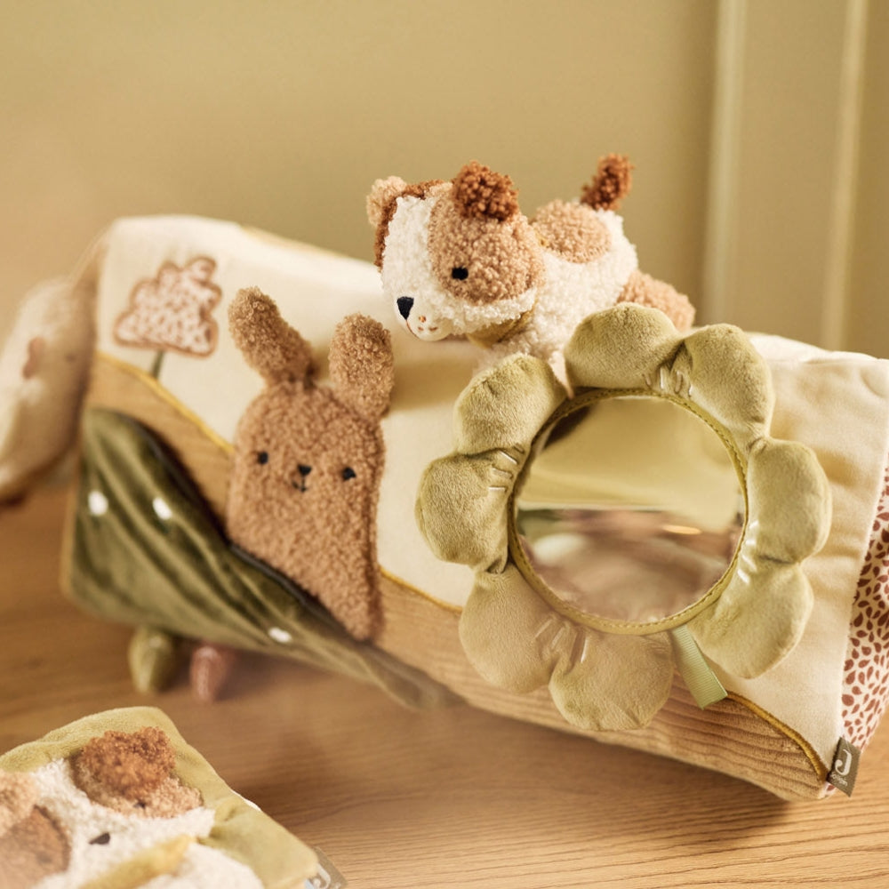 Zabawka została wyposażona w różnorodne elementy aktywizujące, w tym lusterko idealne do zabawy na brzuszku, które zachęca dziecko do podnoszenia główki i obserwowania swojego odbicia.