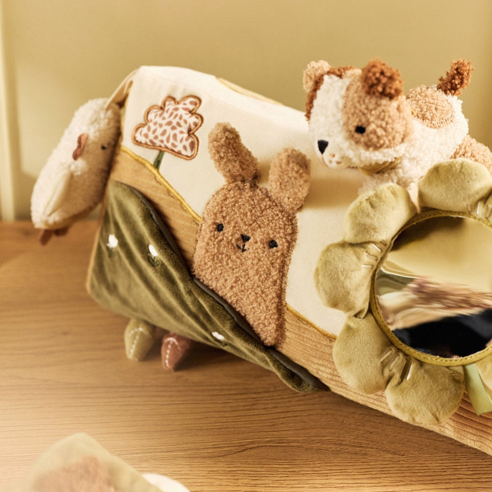 Trójkąt edukacyjny Jollein z kolekcji Tiny Park to urocza zabawka sensoryczna, która doskonale sprawdzi się podczas codziennej zabawy w kojcu lub na macie.