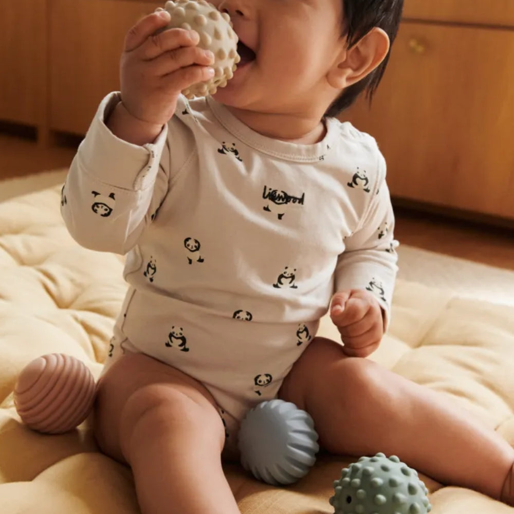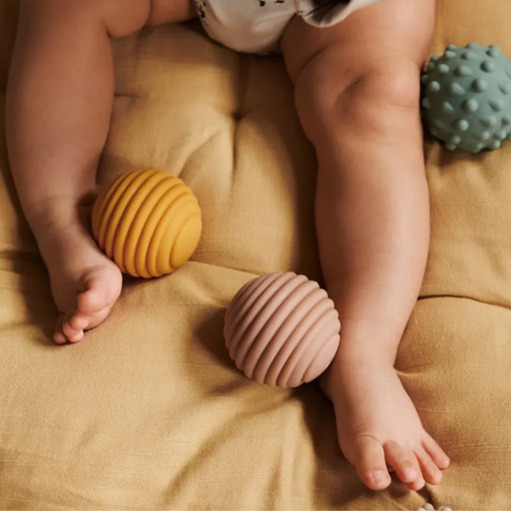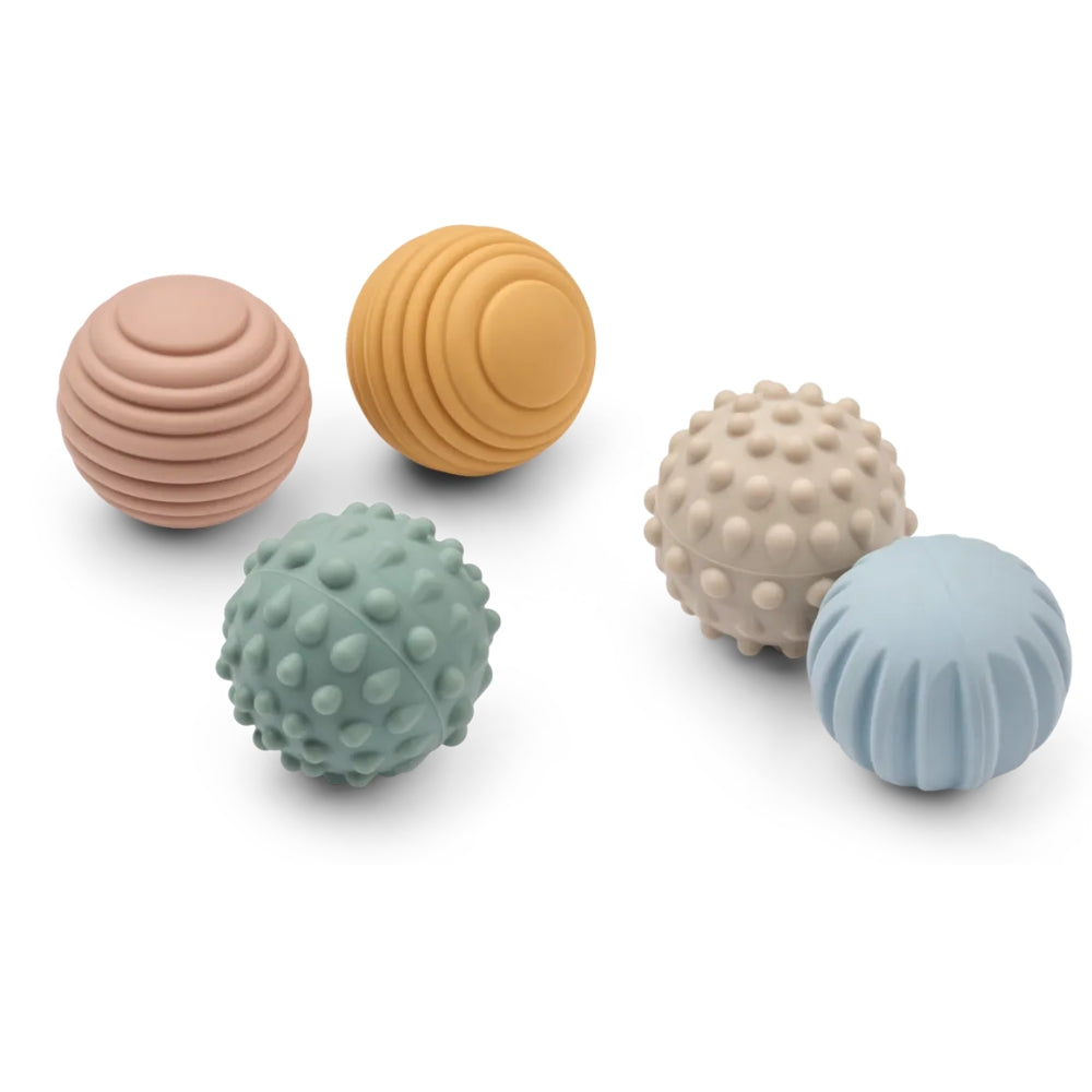 Piłki sensoryczne Liewood to zestaw pięciu miękkich piłeczek o różnych fakturach, które zachęcają niemowlę do odkrywania świata poprzez dotyk.