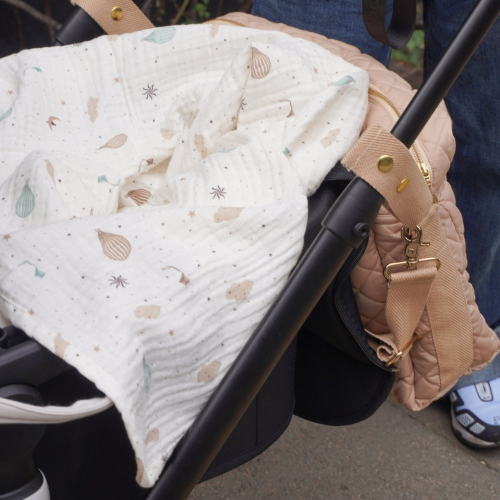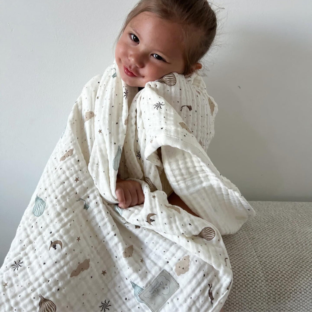 Delikatna tkanina muślinowa, znana z wyjątkowej lekkości i przyjemnej faktury, sprawia, że kocyk jest doskonały do tulenia maluszka, przykrywania w wózku podczas spacerów, a także jako ozdobny dodatek w dziecięcym pokoju.