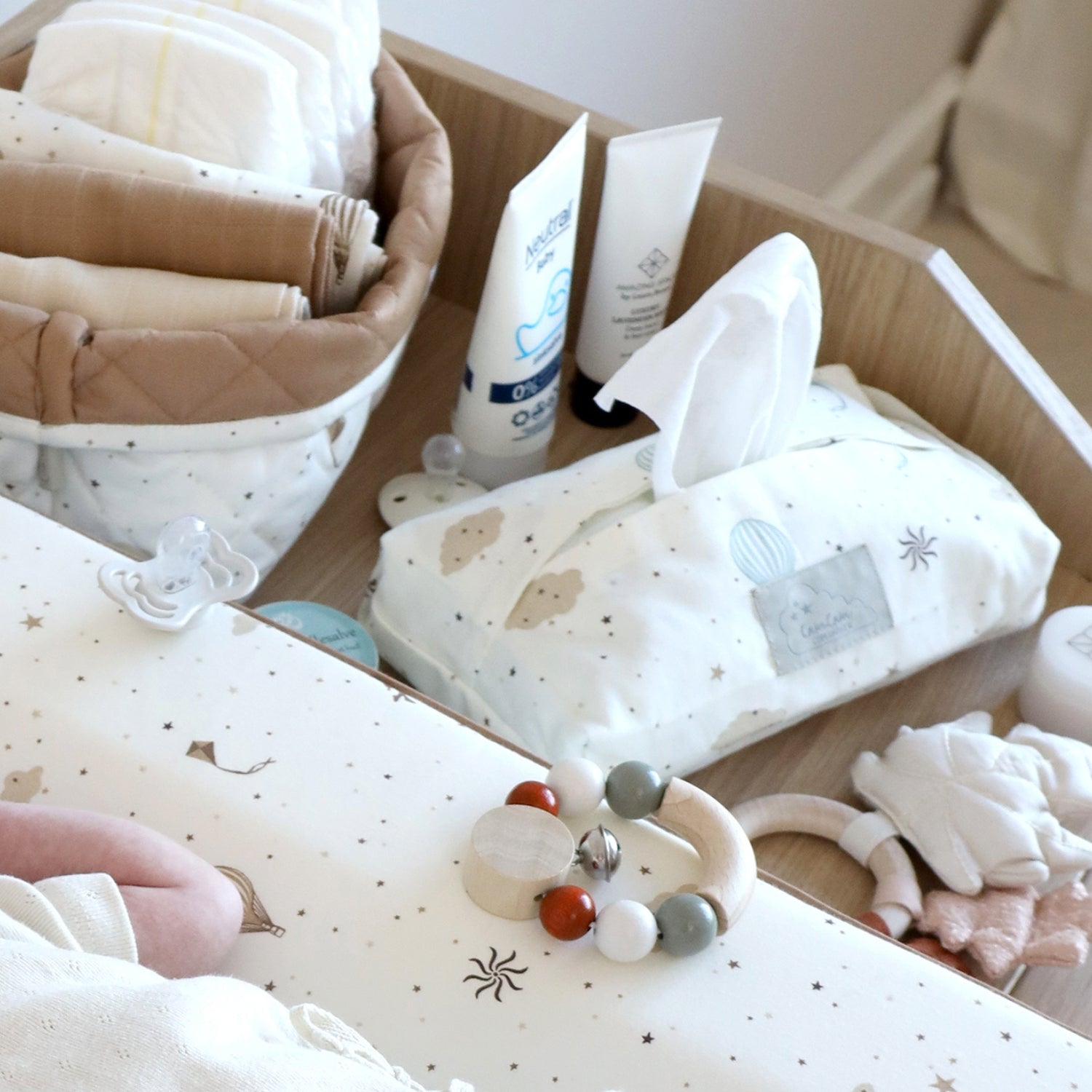 Pokrowiec pasuje do większości standardowych opakowań chusteczek i sprawdzi się zarówno na komodzie przy przewijaku, jak i w dziecięcej torbie, zapewniając elegancję i funkcjonalność w każdej sytuacji.