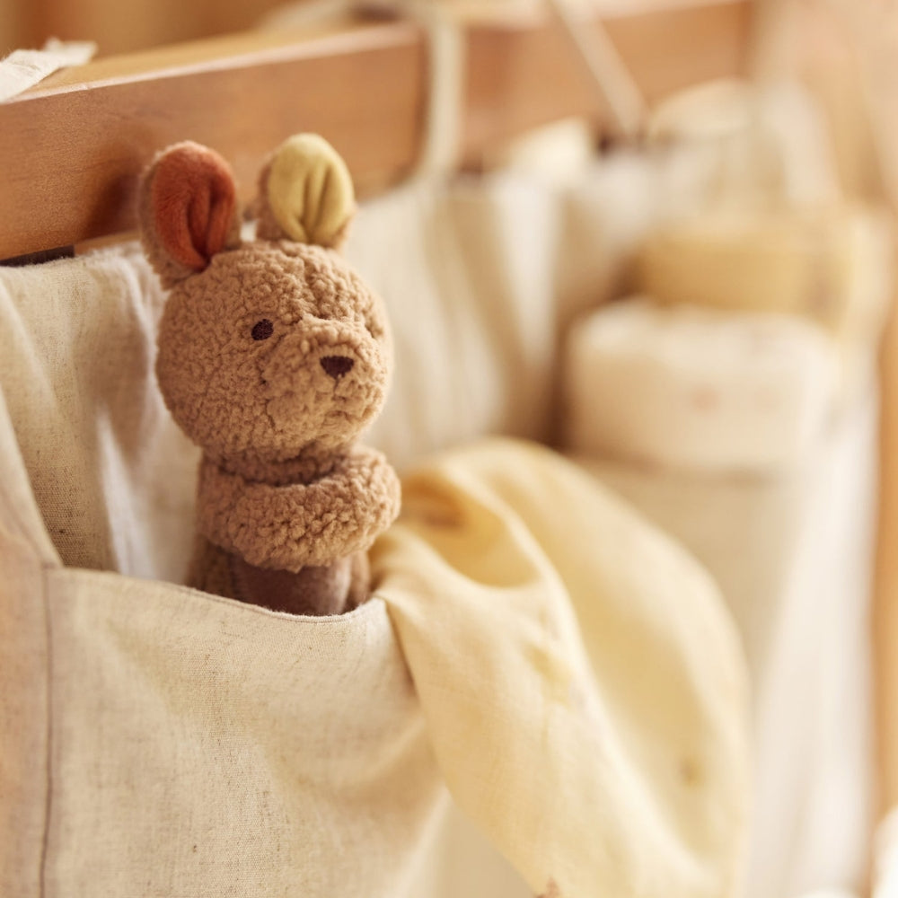 Grzechotka od Jollein z motywem małego kangurka to uroczy towarzysz codziennych zabaw i przytulanek.