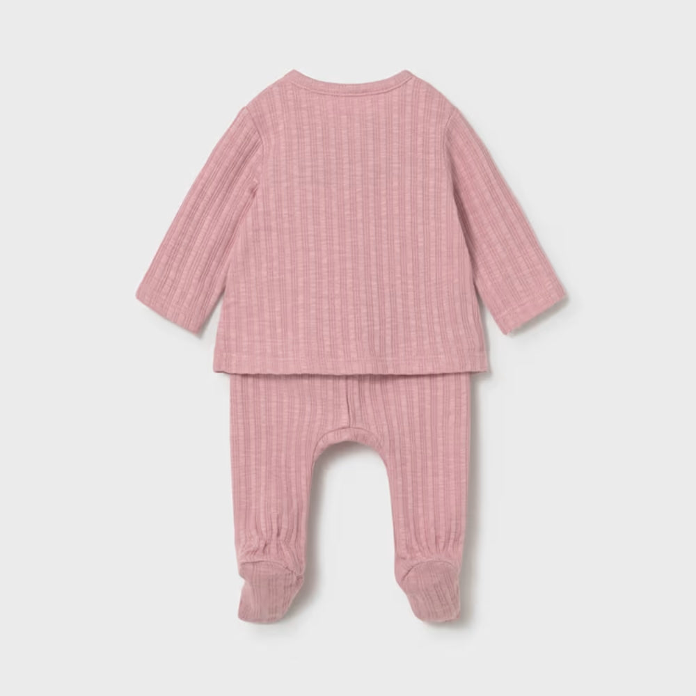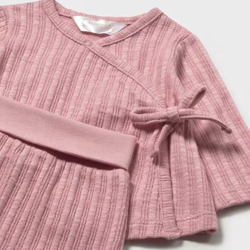 Komplet dla dziewczynki Mayoral to starannie zaprojektowany zestaw dla noworodka, który łączy wygodę z delikatnym, dziewczęcym stylem.
