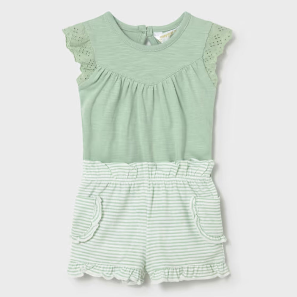 W komplecie znajdują się dwa body w kolorze białym i zielonym oraz dwa zielone szorty, które można łatwo ze sobą zestawiać.