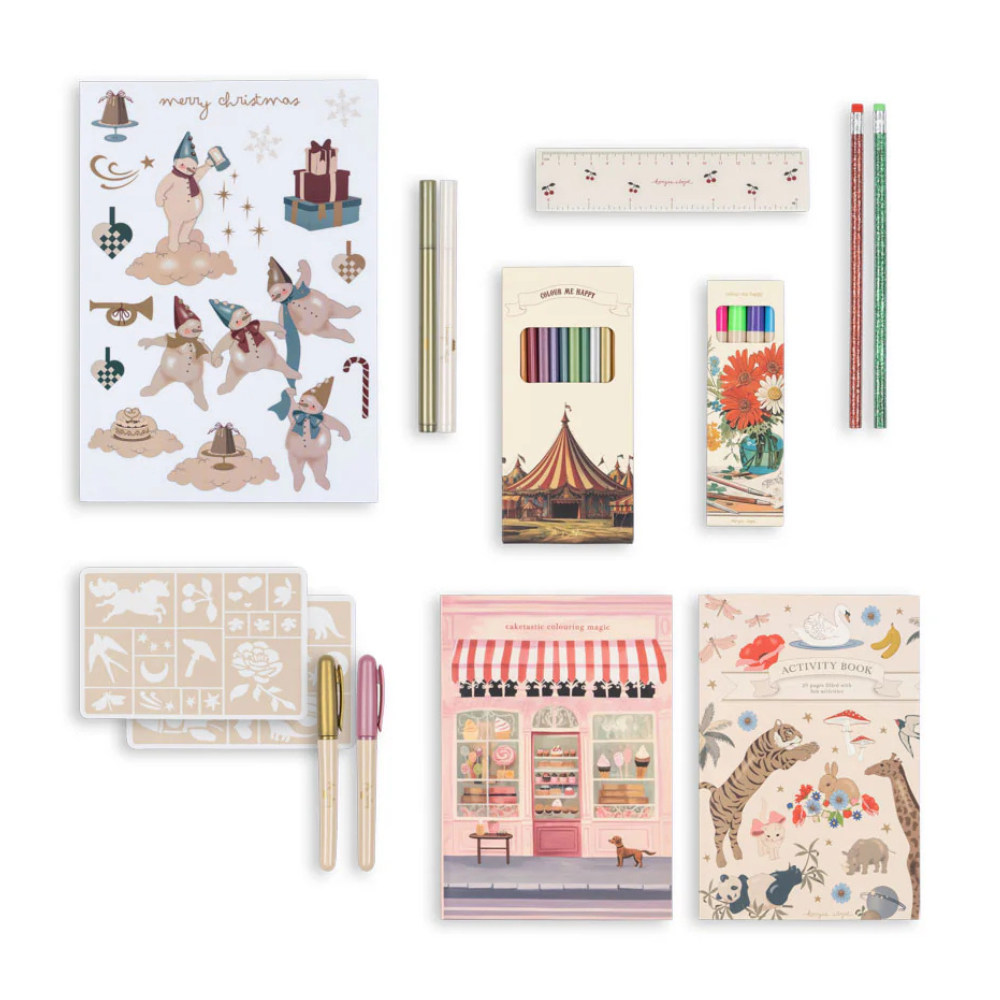 - Zestaw zawiera: tatuaże świąteczne, malutkiego misia, książeczkę aktywności (20 stron), 12 metalicznych kredek, kalejdoskop, magiczną sprężynę, ołówki do tatuaży ze szablonami, naklejki, bączek, gra karciana „Czarny Kot”, piłeczka skacząca, gra memory (30 elementów), naklejki na okno (2 arkusze), dzwonek rowerowy, kolorowanka A5 (20 stron), stempelki, dekoracja, kamyki dekoracyjne, 4 magiczne pisaki, notes, mini puzzle, pisaki do okien (2 szt.), linijka oraz brokatowe ołówki