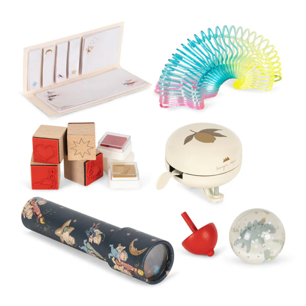 - Zestaw zawiera: tatuaże świąteczne, malutkiego misia, książeczkę aktywności (20 stron), 12 metalicznych kredek, kalejdoskop, magiczną sprężynę, ołówki do tatuaży ze szablonami, naklejki, bączek, gra karciana „Czarny Kot”, piłeczka skacząca, gra memory (30 elementów), naklejki na okno (2 arkusze), dzwonek rowerowy, kolorowanka A5 (20 stron), stempelki, dekoracja, kamyki dekoracyjne, 4 magiczne pisaki, notes, mini puzzle, pisaki do okien (2 szt.), linijka oraz brokatowe ołówki