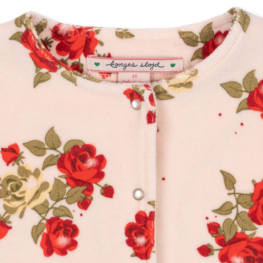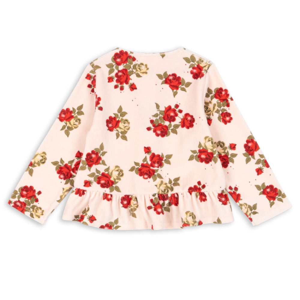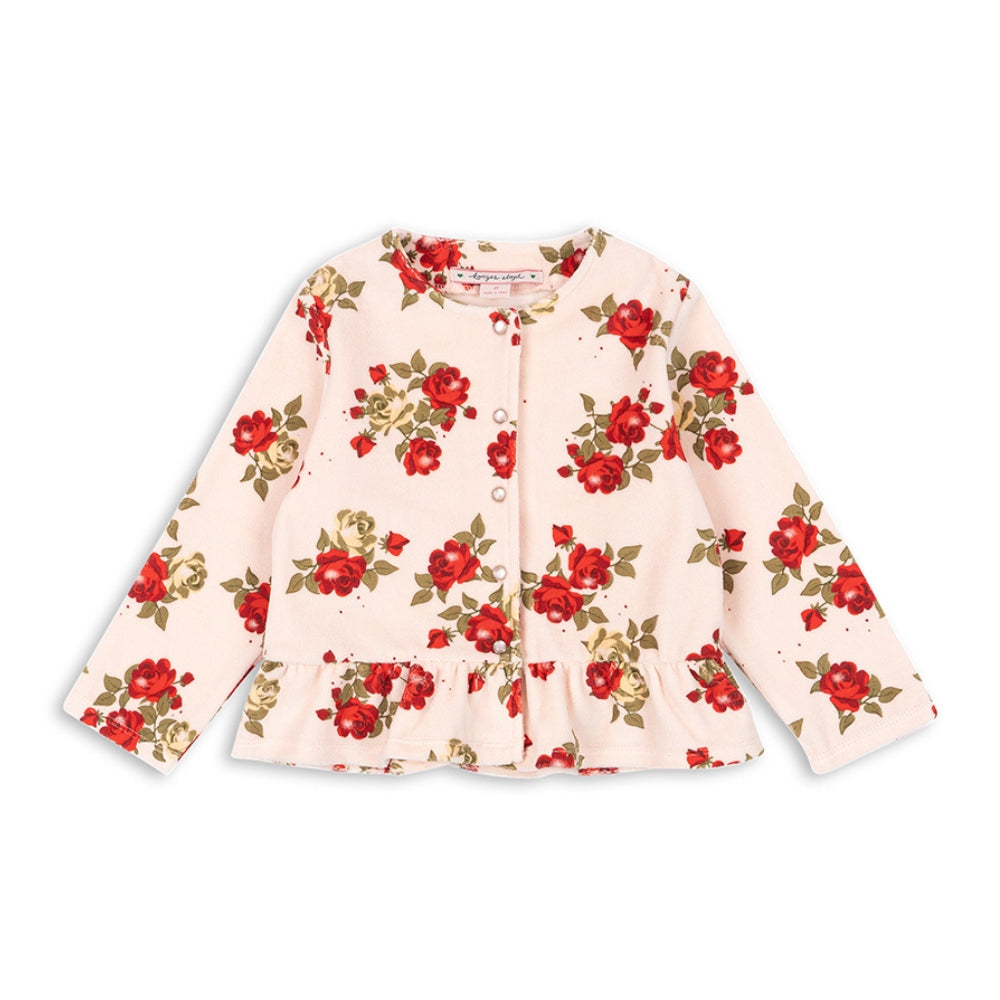 Kardigan dziewczęcy Konges Slojd to miękki, welurowy w dotyku sweterek z uroczą baskinką, zapinany z przodu na praktyczne napy.