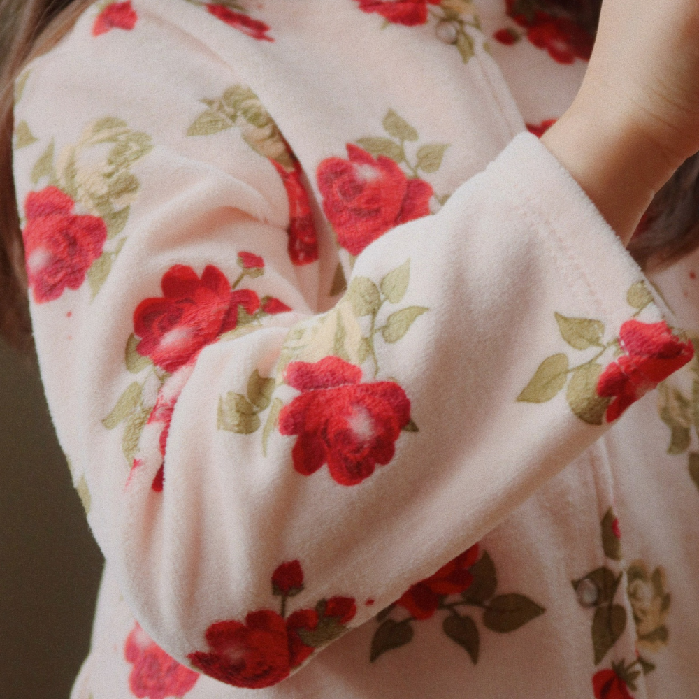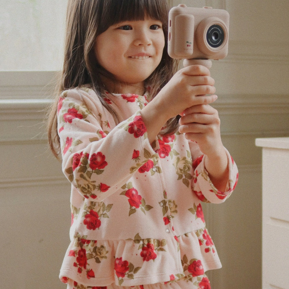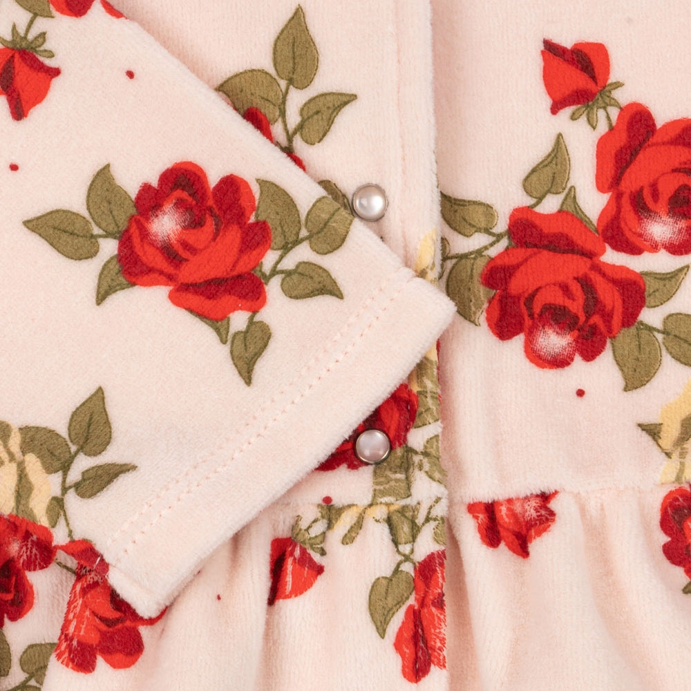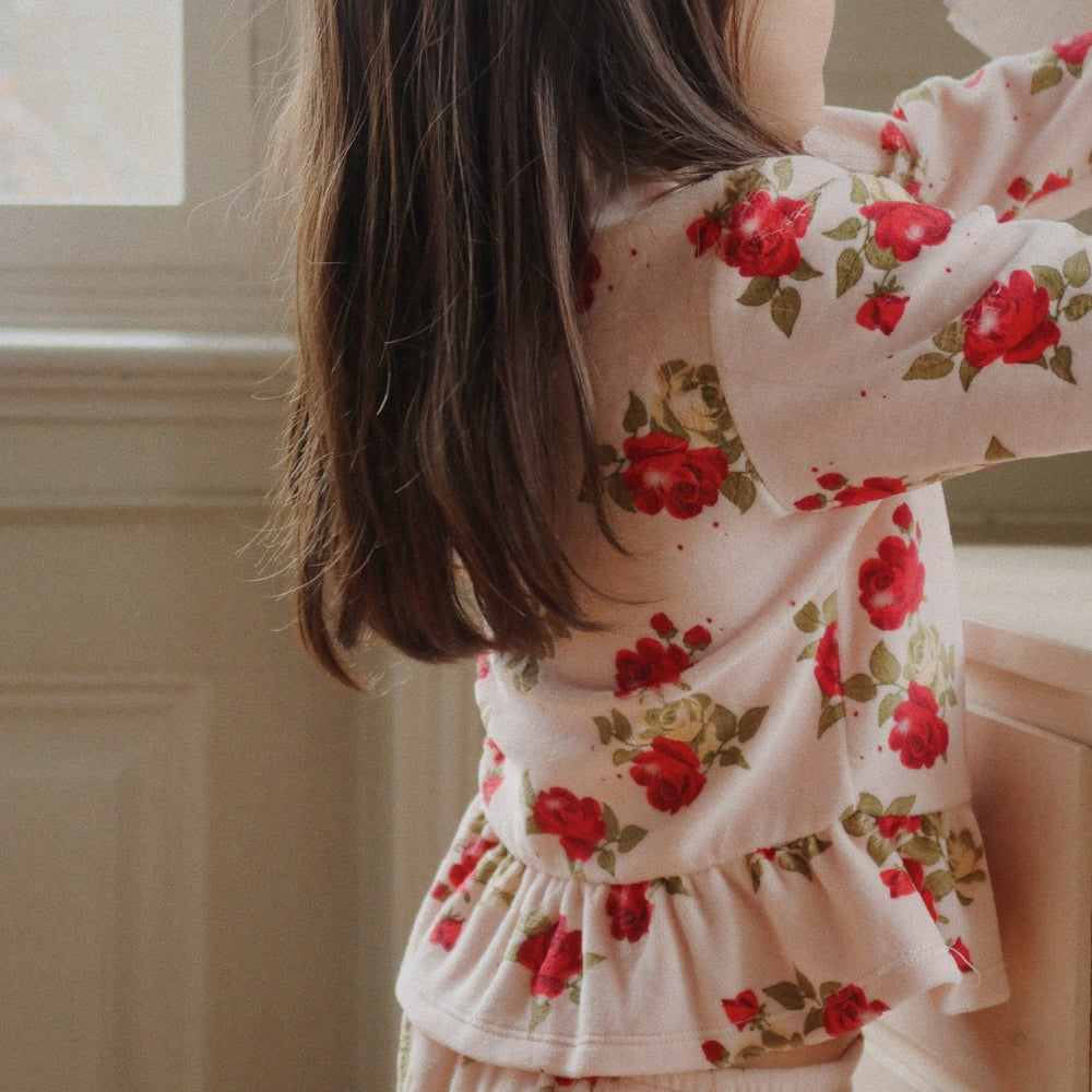 Kardigan dziewczęcy Konges Slojd to miękki, welurowy w dotyku sweterek z uroczą baskinką, zapinany z przodu na praktyczne napy.