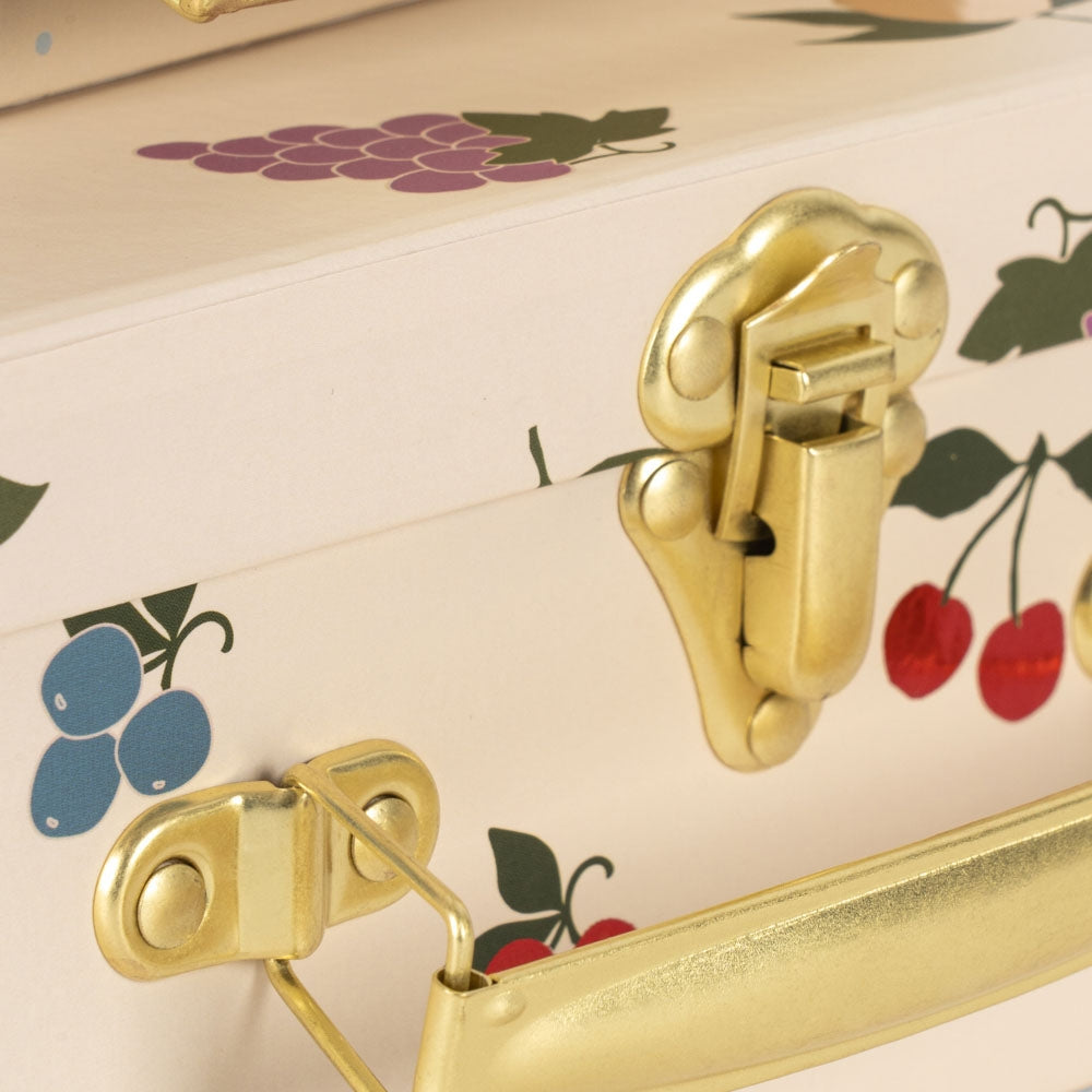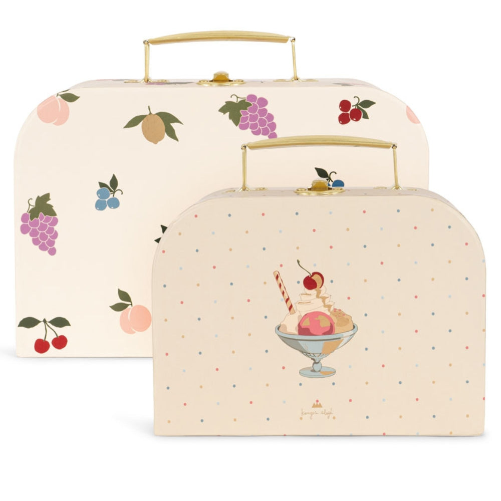 Ten uroczy zestaw dwóch kartonowych walizek pozwala w prosty sposób uporządkować zabawki, drobiazgi i pamiątki, a jednocześnie stanowi piękny element dekoracyjny w pokoju dziecka.