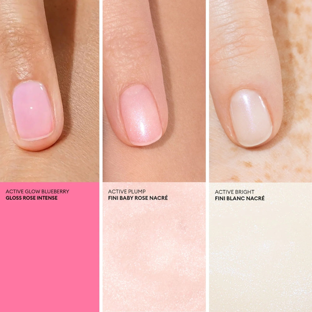 Drugi lakier, Active™ Plump, wzbogacony kolagenem roślinnym i ekstraktem z brzoskwini, nadaje paznokciom objętość oraz perłowo-różowy odcień.
