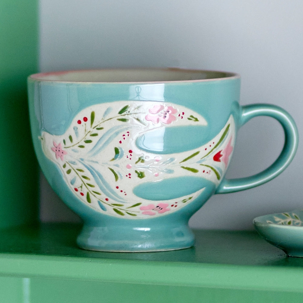 Delikatnie rozszerzana podstawa oraz subtelnie różowa krawędź nadają mu lekkości i elegancji, a ręcznie malowane motywy ptaków, kwiatów i liści przyciągają wzrok.
