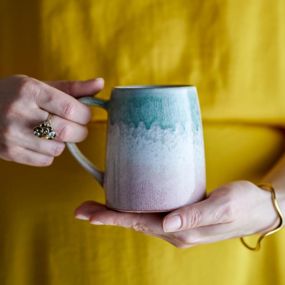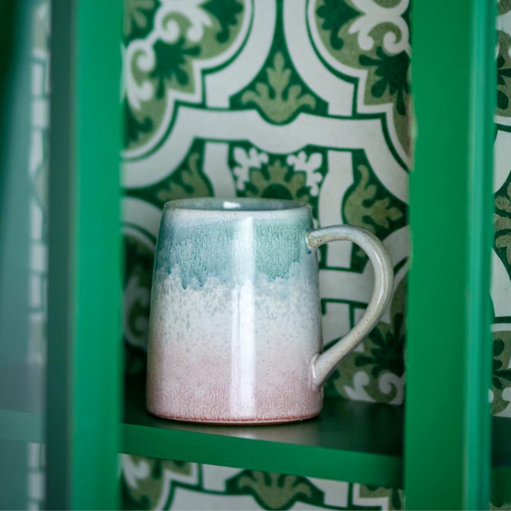 Dzięki stonowanej zieleni z kremowymi i różanymi tonami zestaw kubków z kamionki świetnie dopełni aranżacje w duchu natury.