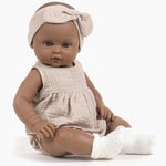 Lalka jest rozmiarów 47cm i posiada piękną beżową sukienkę opaskę na głowę oraz białe skarpetki.