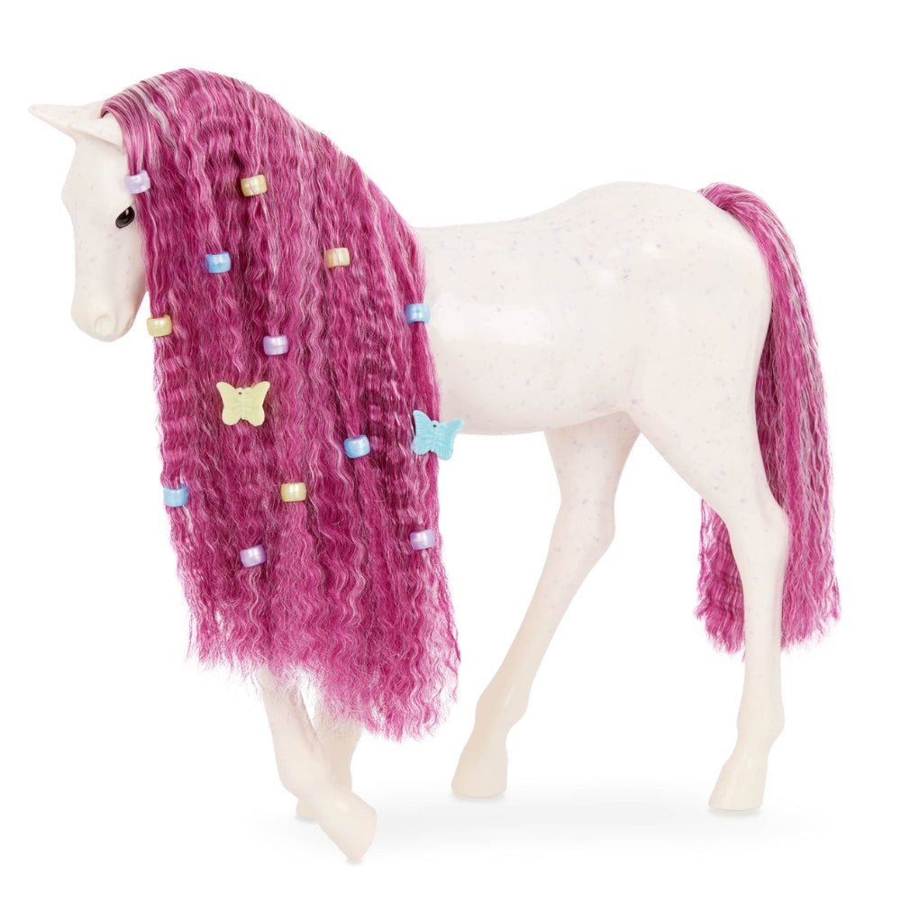 Lalka dla dzieci posiada ciemną karnacje, różowe włosy i brązowe oczy oraz źrebaka do czesania wraz z ozdobami do włosów.