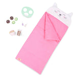 - W zestawie: lalka 46cm, dwuczęściowa pidżamka z długim rękawem i długimi spodniami, jasnoróżowa z białymi oblamówkami i nadrukiem w kotki, bielizna, wsuwane białe kapcie, śpiwór z uroczym kocim motywem, miseczka popcornu, 2 ciasteczka, szklanka mleka czekoladowego, maseczka na twarz, 2 plastry ogórka – na oczy, 2 buteleczki (udawanego) lakieru do paznokci.