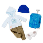 Śliczna lalka dla dzieci Milo z walizką i akcesoriami podróżnymi marki Our Generation.