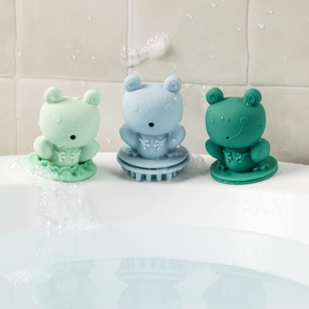 Te zabawki do kąpieli angażują maluszka na wiele sposobów: ciemnozielona żabka tryska wodą, niebieska figurka ma przyjemne, masujące wypustki i otworki tworzące delikatny „deszcz”, a jasnozielona – po dolaniu odrobiny mydła – robi efektowną, bąbelkową pianę.