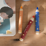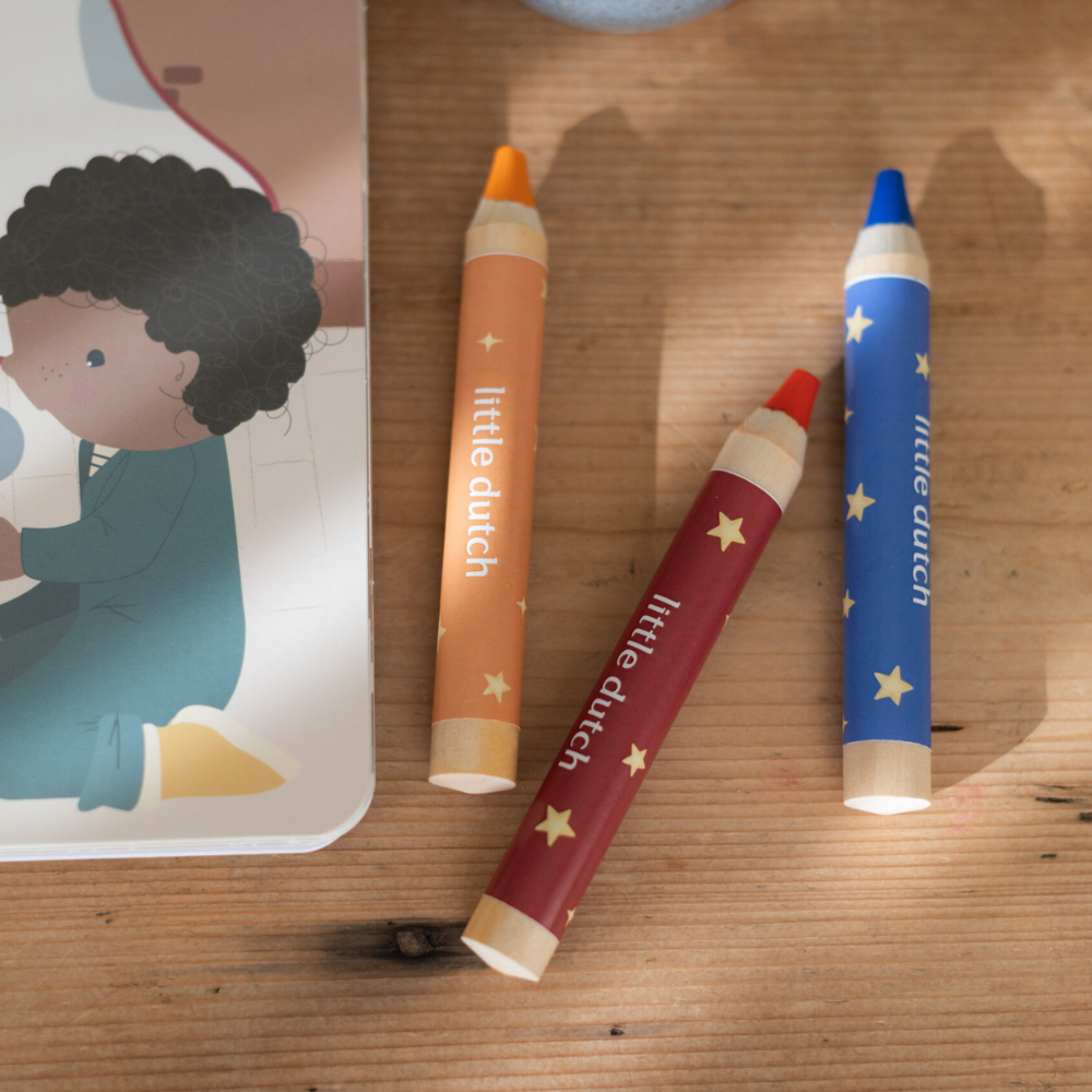 Trzy miękkie kredki, dopasowane do małych rączek, ułatwiają pierwsze próby artystyczne, a wytrzymały papier zapewnia komfort i trwałość.