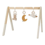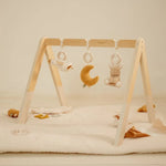 Drewniana konstrukcja jest stabilna i bezpieczna, a dołączone miękkie zawieszki – księżyc, króliczek i gąska – zachęcają dziecko do wyciągania rączek, chwytania i poznawania różnych kształtów oraz faktur.