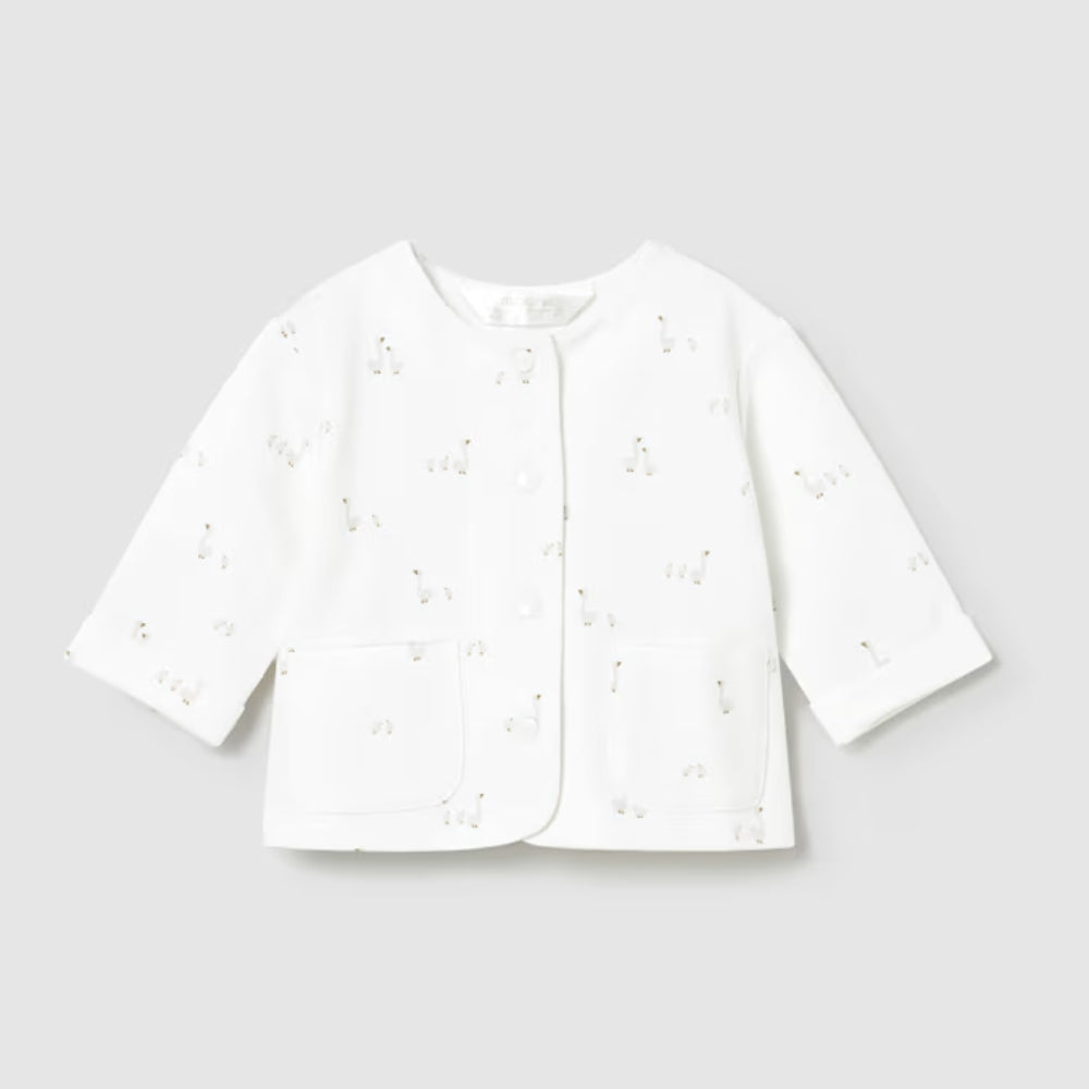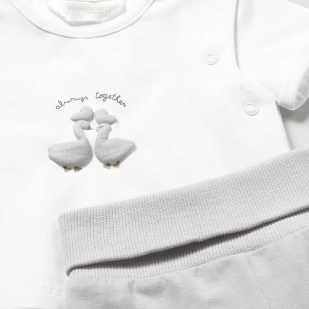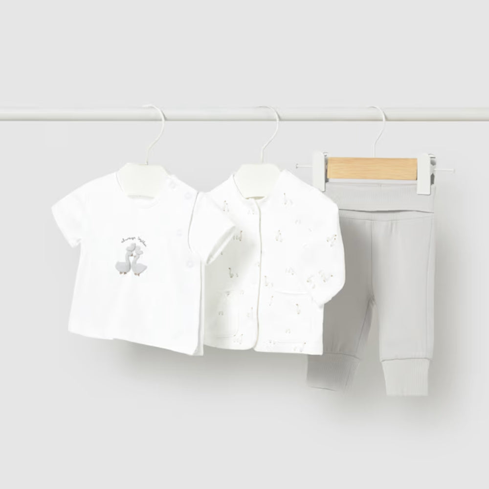Uroczy motyw gąsek sprawia, że komplet dla noworodka prezentuje się wyjątkowo delikatnie i dziecięco.