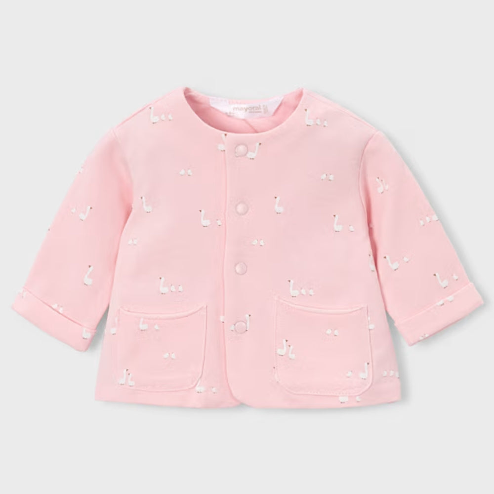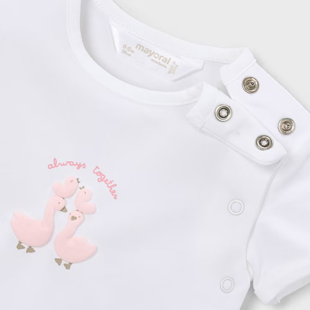 Uroczy motyw gąsek sprawia, że komplet dla noworodka prezentuje się wyjątkowo delikatnie i dziecięco.