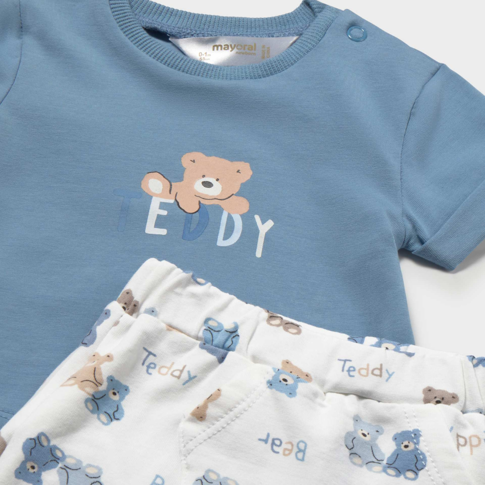 Komplet niemowlęcy przyciąga uwagę subtelną grafiką z napisem „Teddy”, która nadaje całości dziecięcego charakteru.