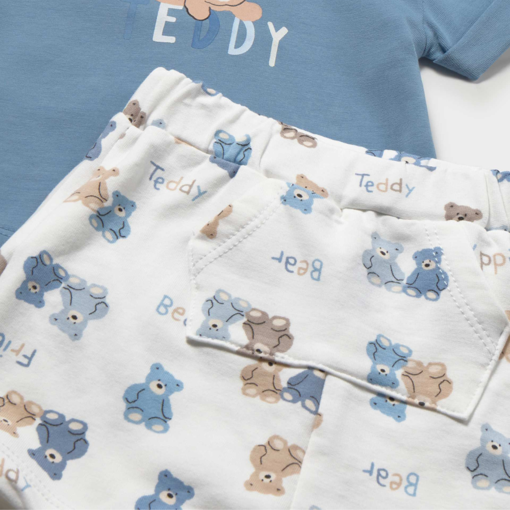 Zestaw składa się z koszulki z krótkim rękawem w delikatnym niebieskim kolorze oraz krótkich spodenek w jasnym odcieniu z powtarzalnym motywem misiów.