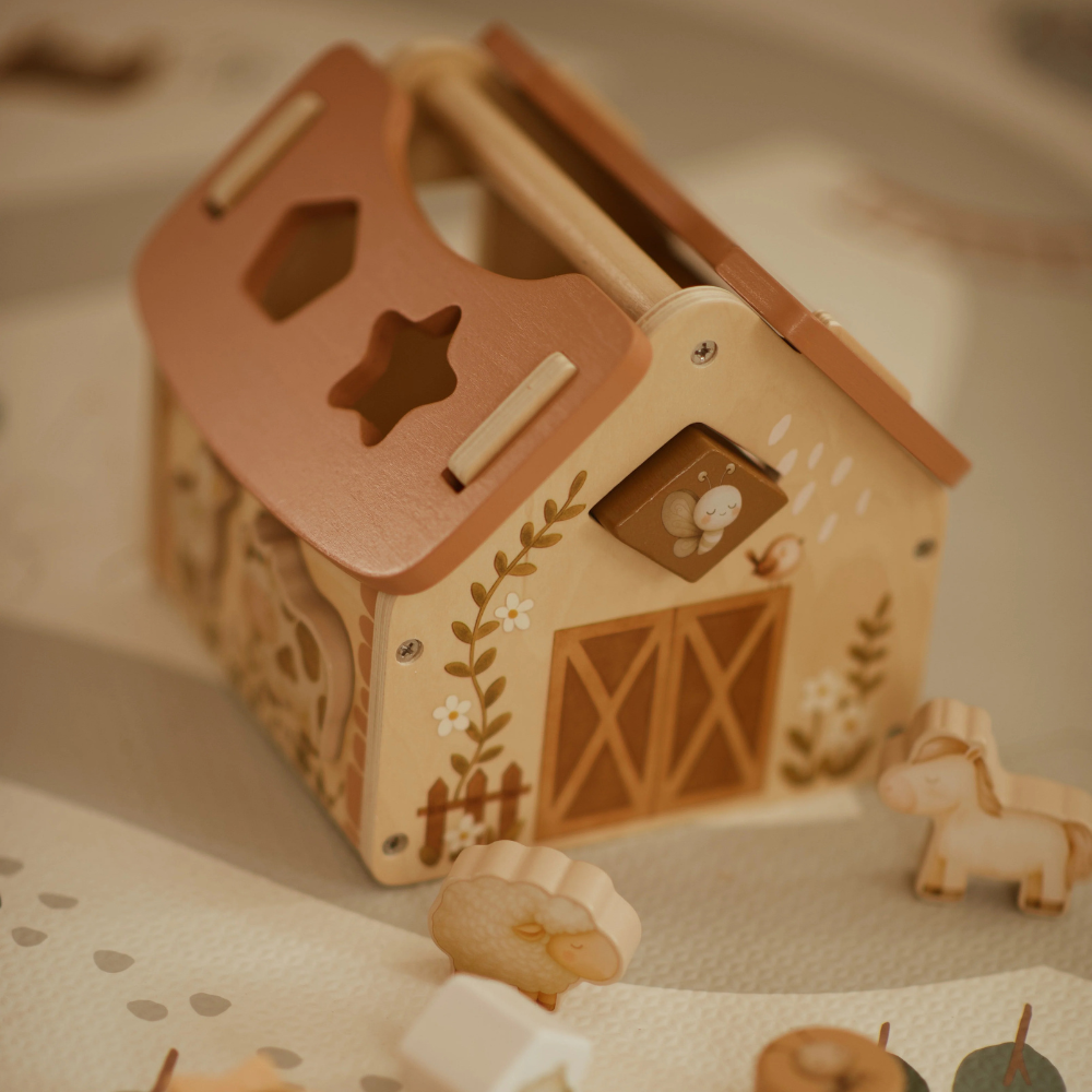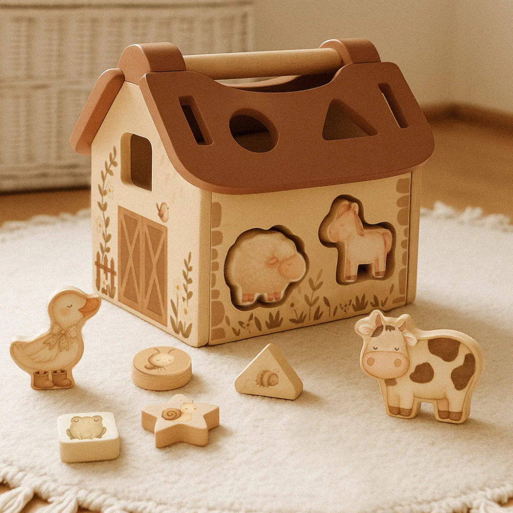 Ta drewniana stodoła zachęca do swobodnej, montessoriańskiej zabawy: bez migających bodźców, za to z naturalnymi materiałami i prostym mechanizmem „próbuj–sprawdź–odkryj”.
