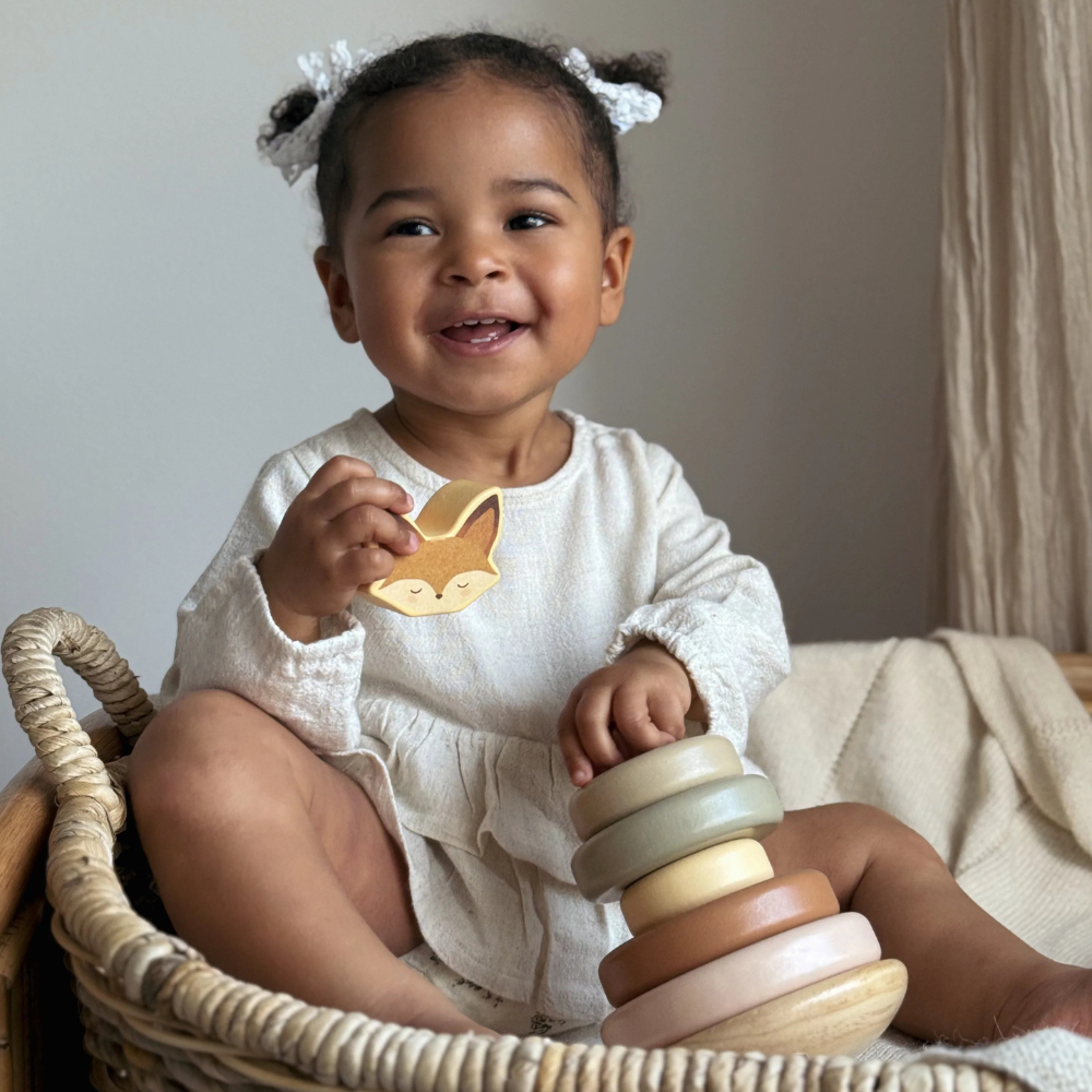 Kolorowe krążki w kształcie lisa tworzą drewniane puzzle do wieży, które dziecko nakłada w odpowiedniej kolejności, ćwicząc motorykę i koncentrację.