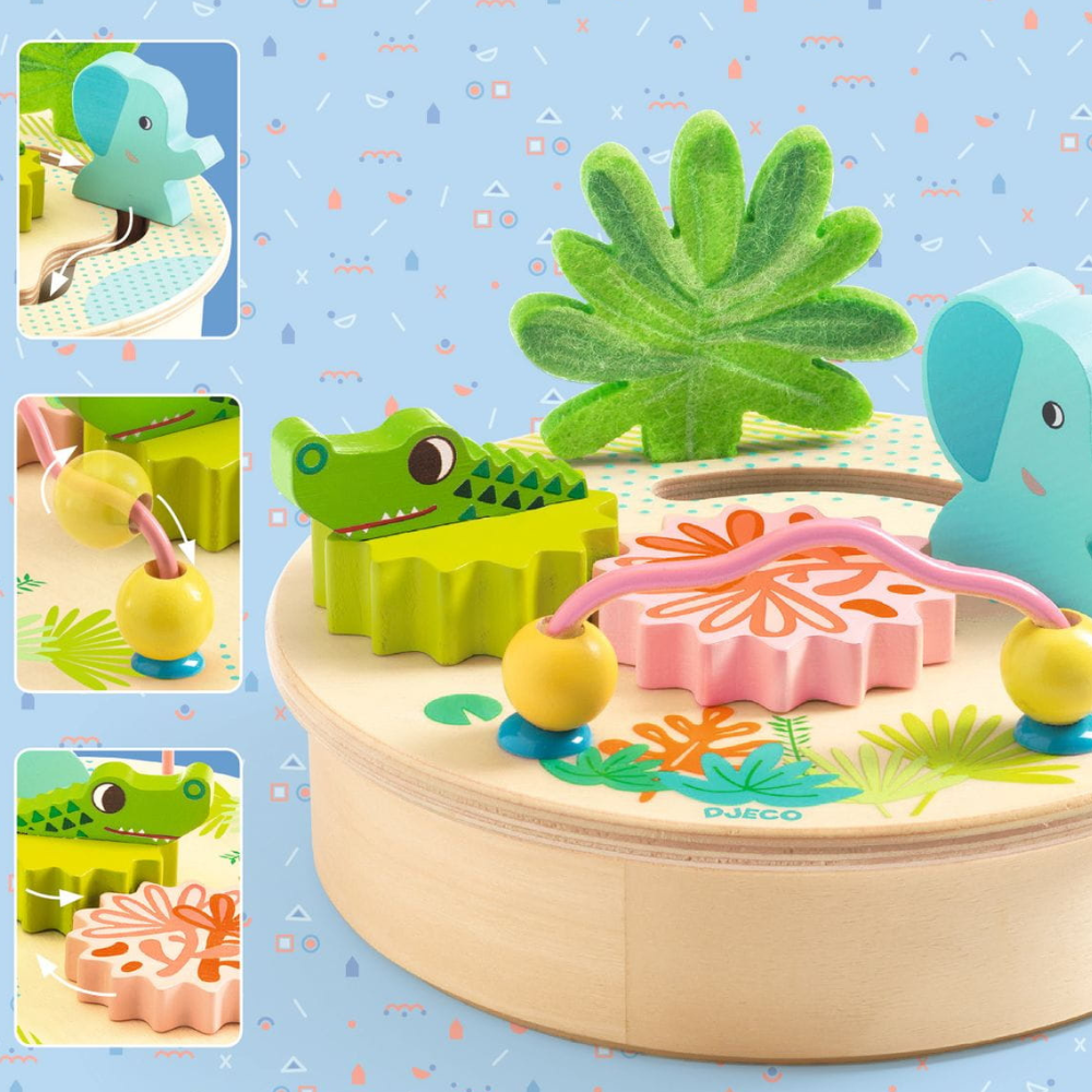 Na wierzchu okrągłego stolika znajdziesz koraliki do przesuwania, słonika chowającego się za krzakami oraz koła zębate z krokodylem.