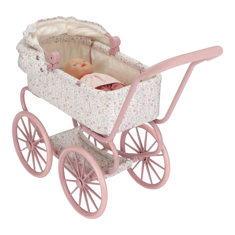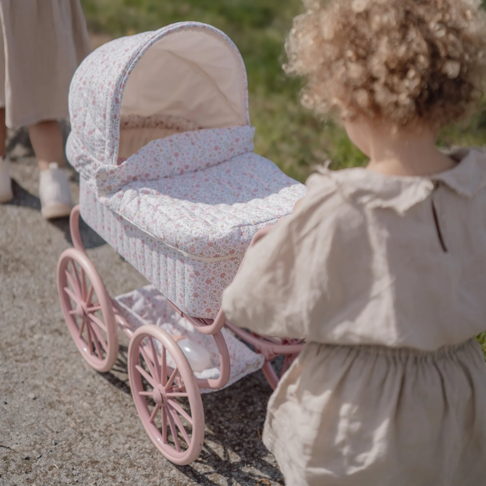 Wózek dla lalek Little Dutch ma stabilną, metalową konstrukcję i praktyczny koszyk na akcesoria, więc pieluszki, buteleczki czy ulubione drobiazgi zawsze są pod ręką. Pastelowy wzór Soft Flowers pięknie ozdobi kącik zabaw i zachęci do codziennych mini-spacerów.