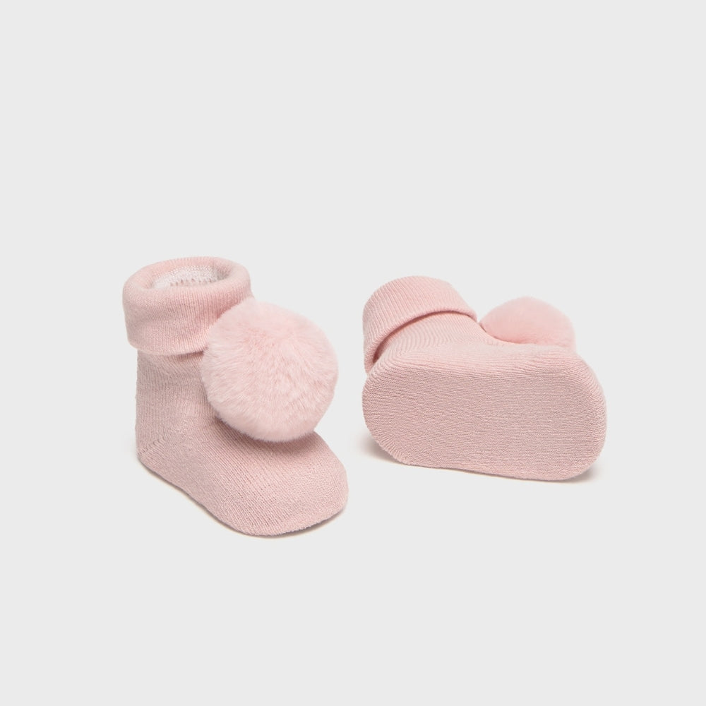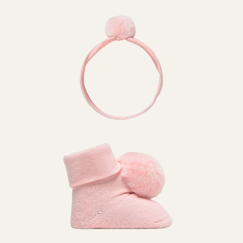 Skarpetki i opaska dla noworodka mają urocze pomponiki i subtelne wykończenia, dzięki czemu zestaw pasuje zarówno na co dzień, jak i na wyjątkowe okazje czy zdjęcia rodzinne.