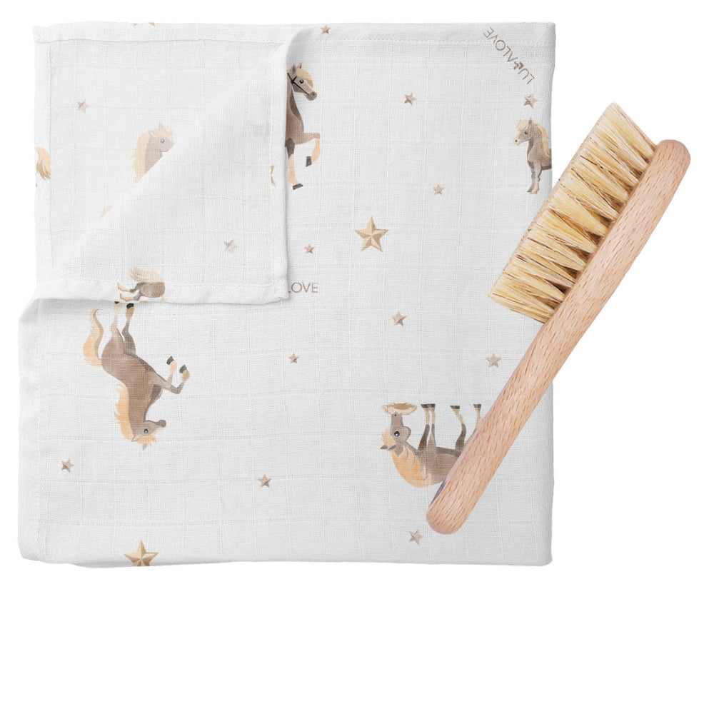 Lullalove Szczotka dla dziecka na ciemieniuchę w zestawie z myjką Konie