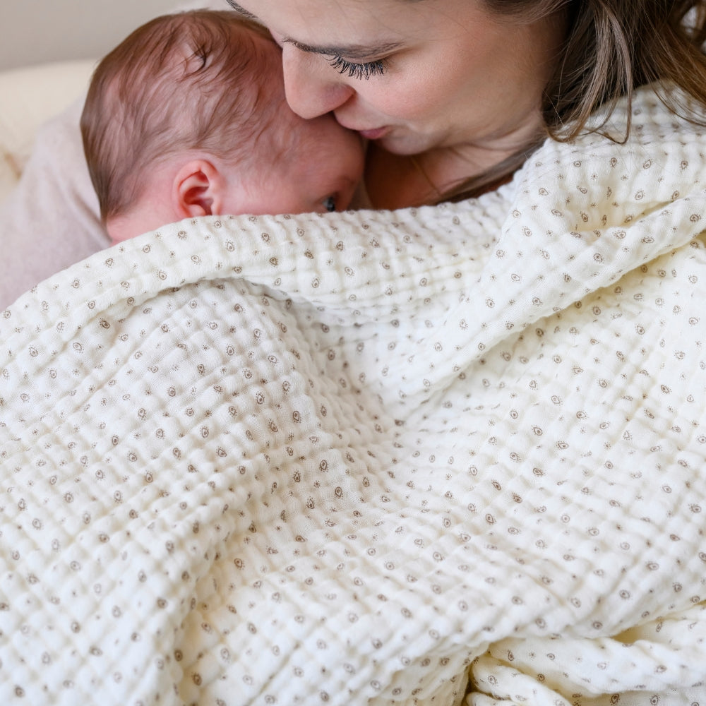Kocyk bawełniany został wykonany z 4 warstw przewiewnej, organicznej bawełny z certyfikatem GOTS, dzięki czemu jest delikatny dla skóry i przyjemny w dotyku.