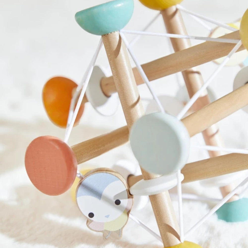 Uwagę przyciągają też małe towarzysze zabawy – ptaszek i pszczółka – które zachęcają do sięgania, manipulowania i oglądania zabawki z każdej strony.