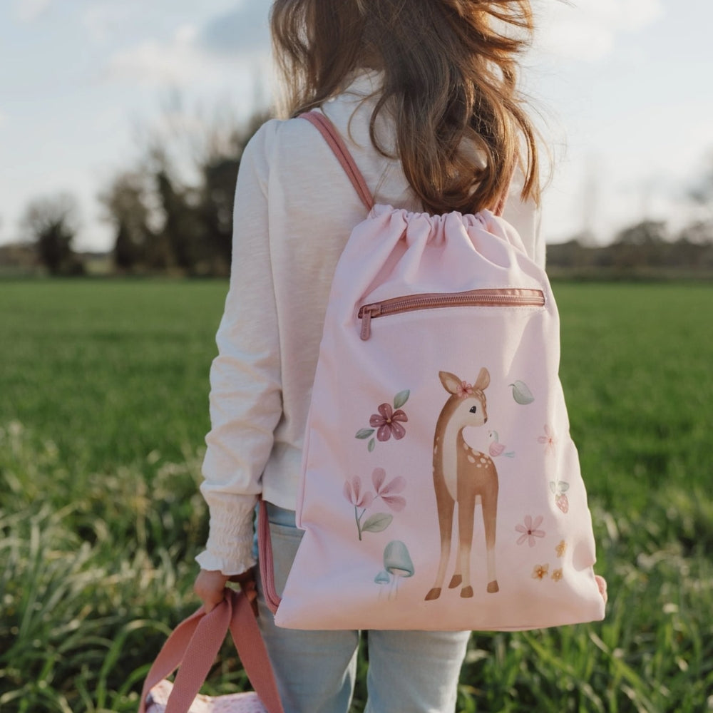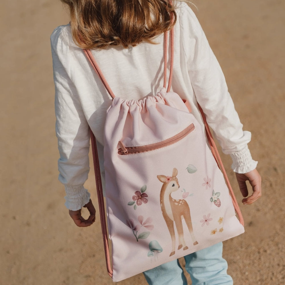 Worek sportowy zachwyca uroczą sarenką i motywami Fairy Garden, dzięki czemu dzieci chętnie zabierają go ze sobą.