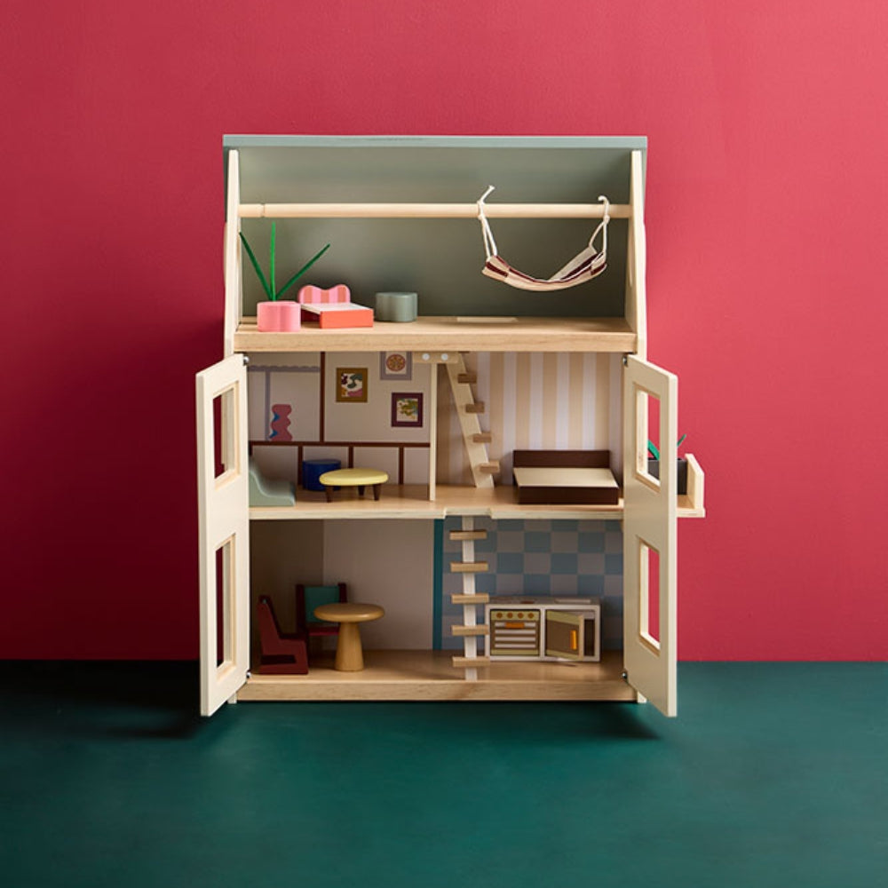 Domek dla lalek Kid’s Concept to trzypoziomowa, drewniana przestrzeń do kreatywnej zabawy, zaprojektowana z myślą o dzieciach, które uwielbiają tworzyć własne historie i aranżować wnętrza.