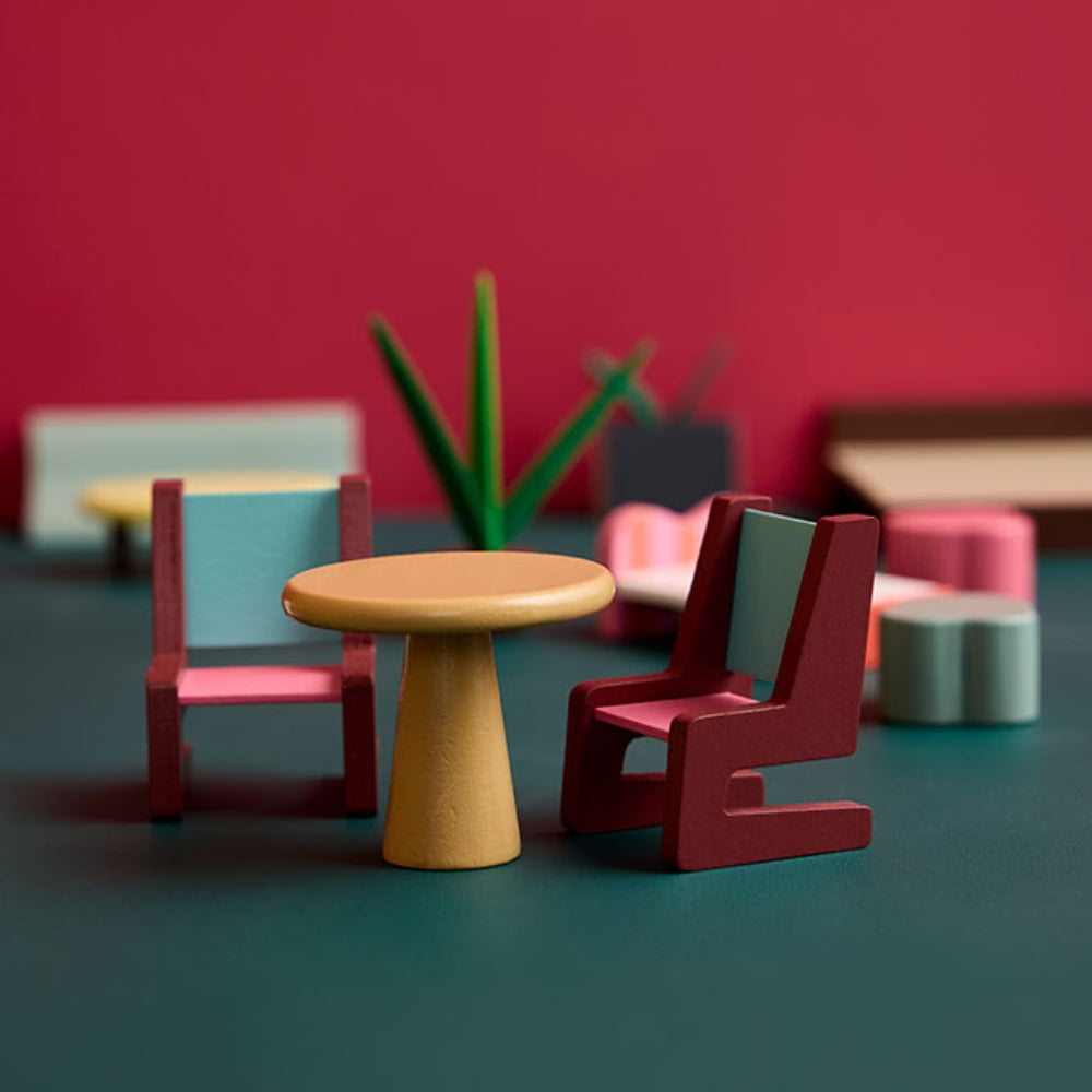 - Zawartość zestawu: drewniany domek, sofa, stolik kawowy, dwa krzesła jadalniane, stół jadalniany, aneks kuchenny, łóżko podwójne, łóżko pojedyncze dla dziecka, hamak, trzy stołki lub stoliki boczne, roślina w doniczce