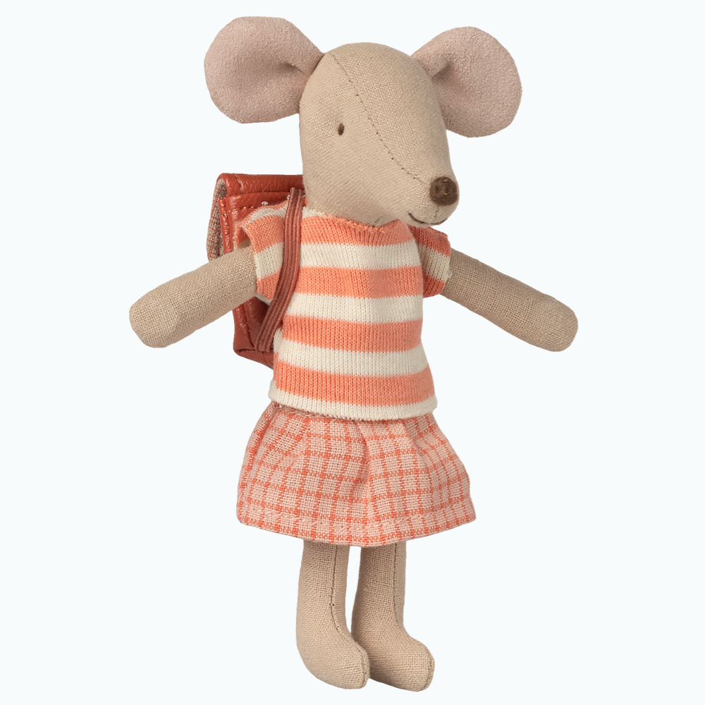 Myszka na trójkołowcu Maileg – Starsza Siostra jest gotowa na cały dzień w szkole i ma plecaczek na najpotrzebniejsze skarby.
