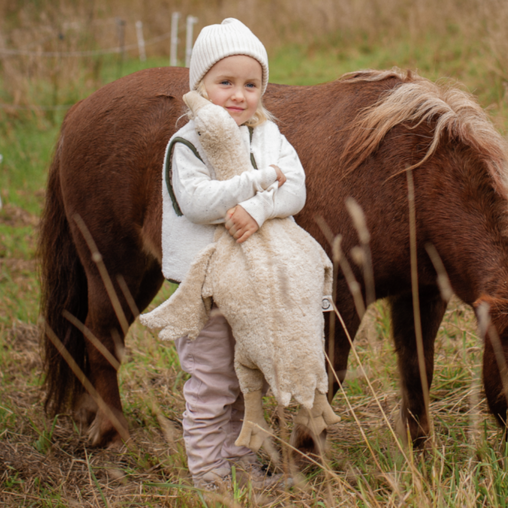 Senger Naturwelt tworzy swoje zabawki ręcznie z certyfikowanej bawełny organicznej GOTS, wypełniając je czystą wełną owczą.