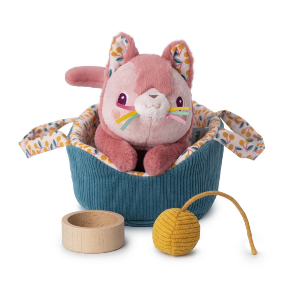 Przytulanka kotek Jeanne z koszyczkiem i akcesoriami od belgijskiej marki Lilliputiens, idealna do tulenia, uspokajania oraz kreatywnej zabawy.